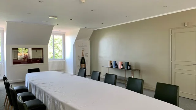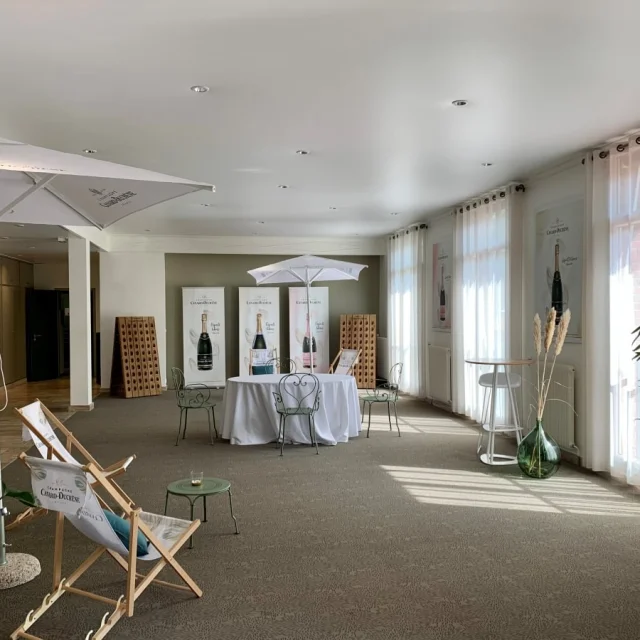 - Petit Salon : Cet espace lumineux et cosy est idéal pour un repas ou cocktail en tout intimité. Terrasse privative et vue sur les vignes de la Montagne de Reims. 50m2 – 15 pers max